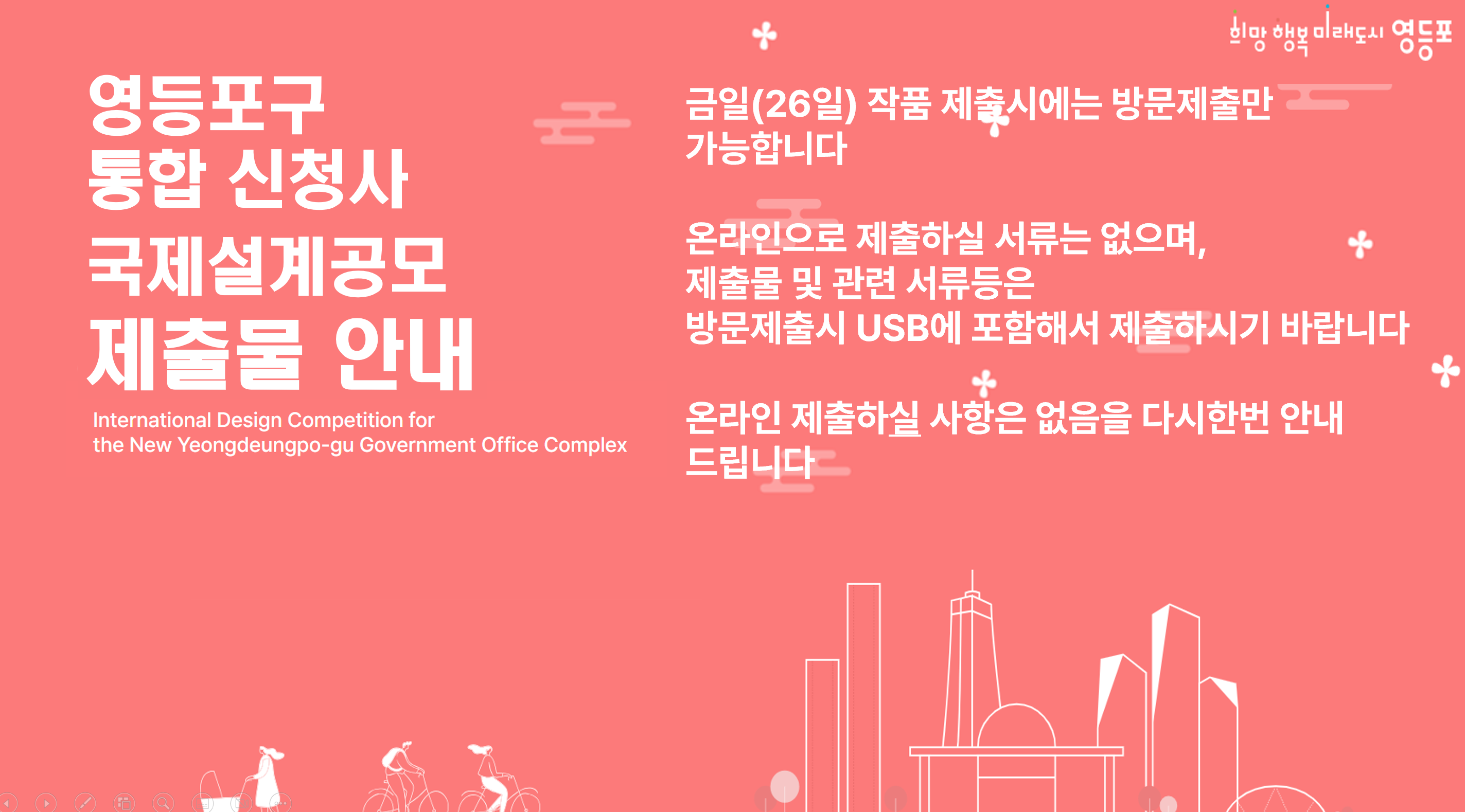영등포구청통합신청사 설계공고 관리팀입니다 금일(26일) 작품 제출시에는 방문제출만 가능합니다 온라인으로 제출하실 서류는 없으며, 제출물 및 관련 서류등은 방문제출시 USB에 포함해서 제출하시기 바랍니다 온라인 제출하신 사항은 없음을 다시한번 안내 드립니다